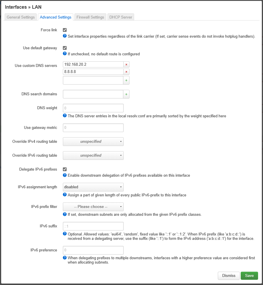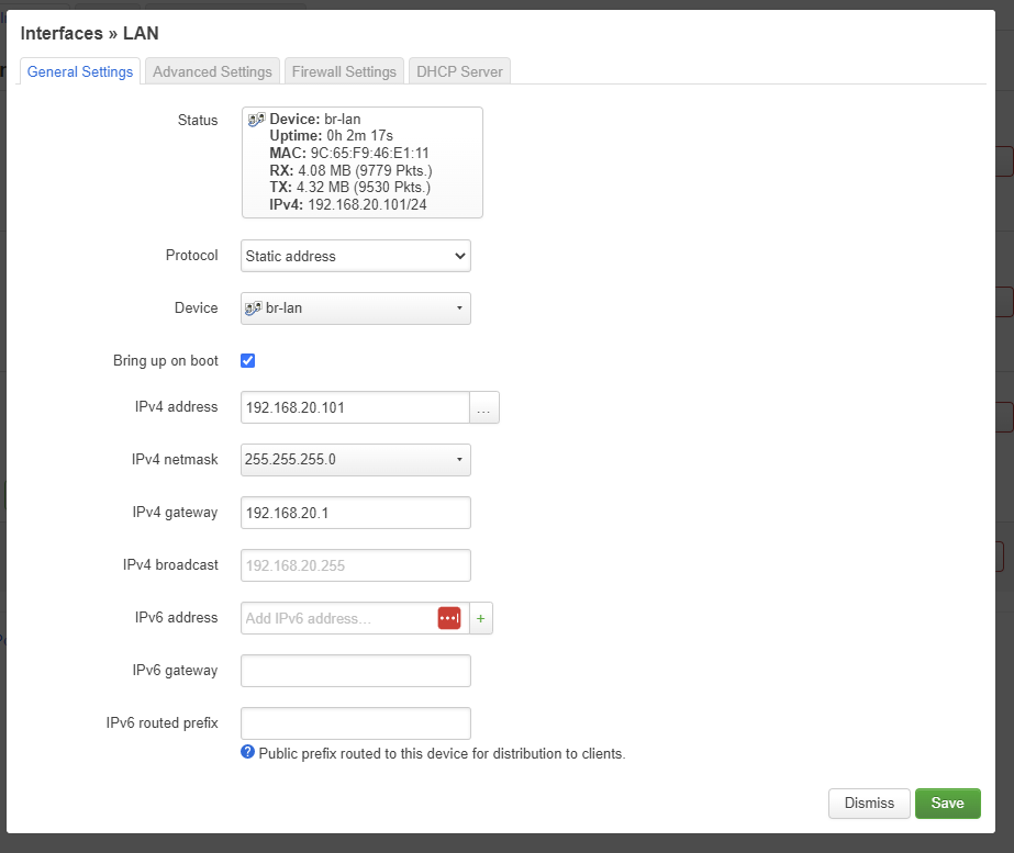 - Do not change "Device". This needs to be set to "br-lan"