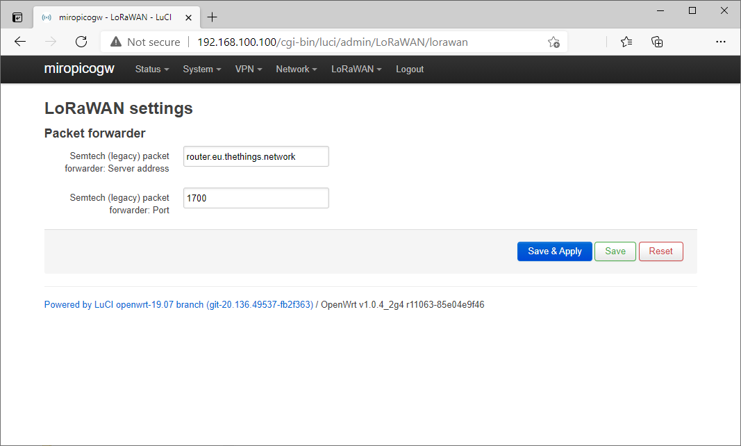 | Semtech packet forwarder server address | Set server address for legacy packet forwarder (e.g. router.eu.thethings.network for TTN EU) |