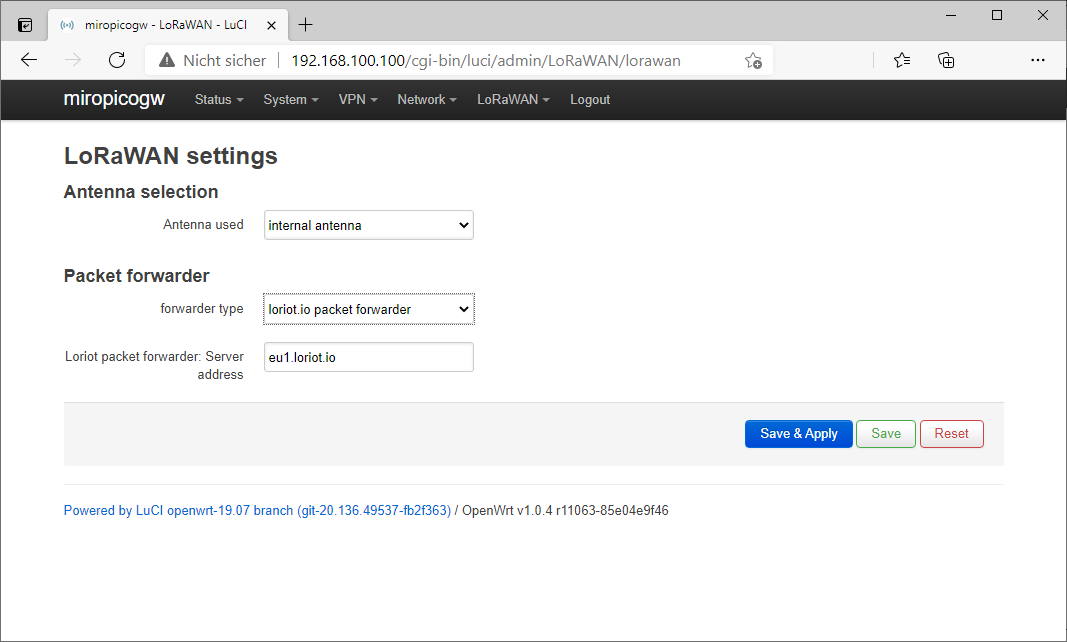 | Forwarder type | Select either optimized LORIOT packet forwarder or legacy Semtech packet forwarder of other LNS |