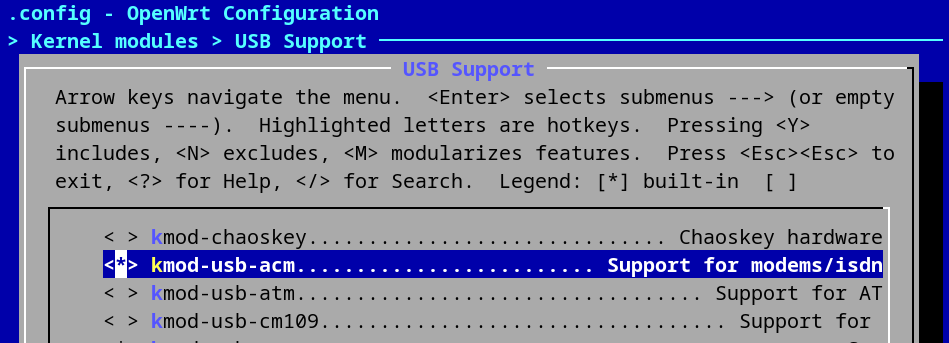 Additionally, the packet forwarders need the kernel module kmod-usb-acm to be included in the firmware. Select it in the menuconfig under Kernel modules -> USB Support -> kmod-usb-acm.
