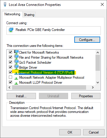 In Local Area Connection Properties select Internet Protocol Version 4 and click the Properties button.