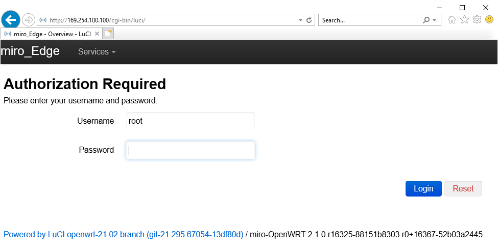To log in access the web frontend of the gateway using your browser. The web frontend is reachable on http://169.254.100.100 in case of direct connection.