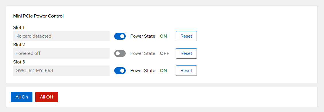 The Edge Slots page controls the power state of the Mini PCIe extension slots. It allows you to power individual slots on or off and reset them. The installed card is auto-detected after a slot is powered.