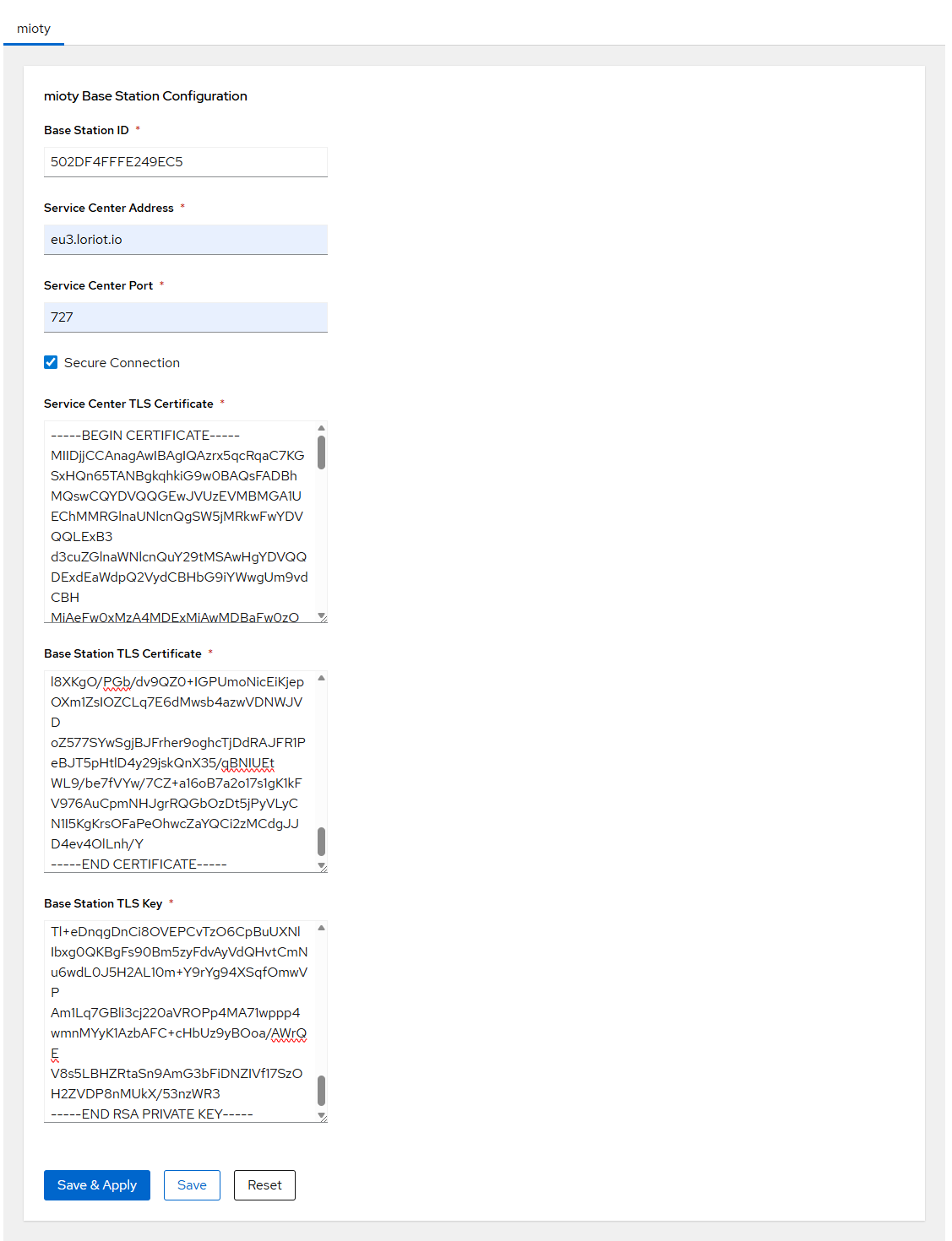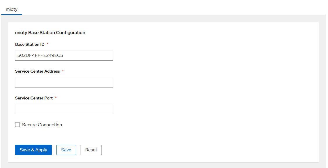 The Base Station EUI defaults to an EUI derived from the device MAC address. It can be overridden manually if your mioty Service Center requires a specific value. Use the auto-derived value unless you have a specific reason to change it.