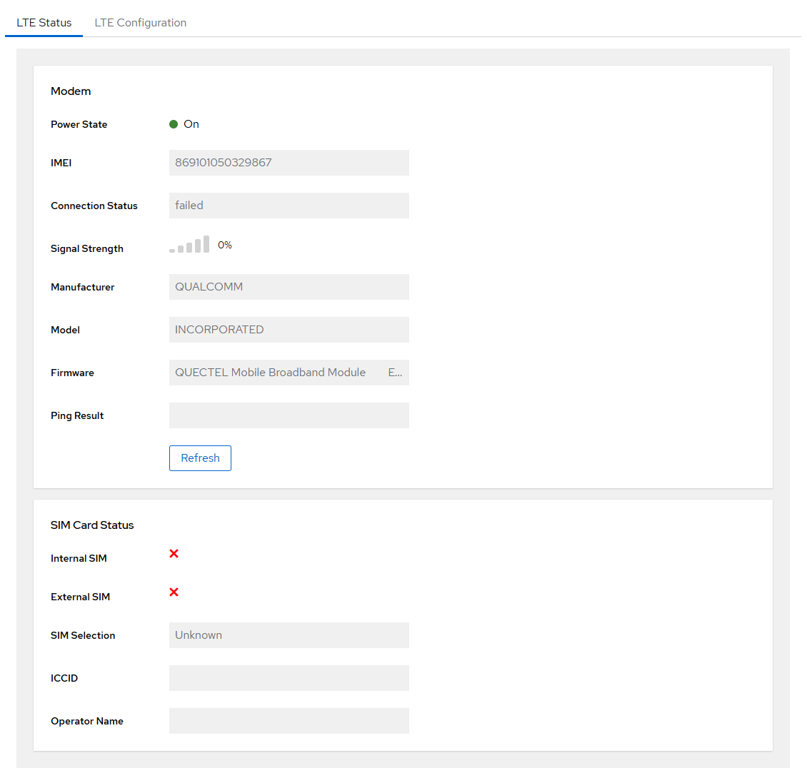 This section is only visible in Cockpit when an LTE modem is installed in the dedicated LTE modem slot. If no modem is present, this section will not appear.
